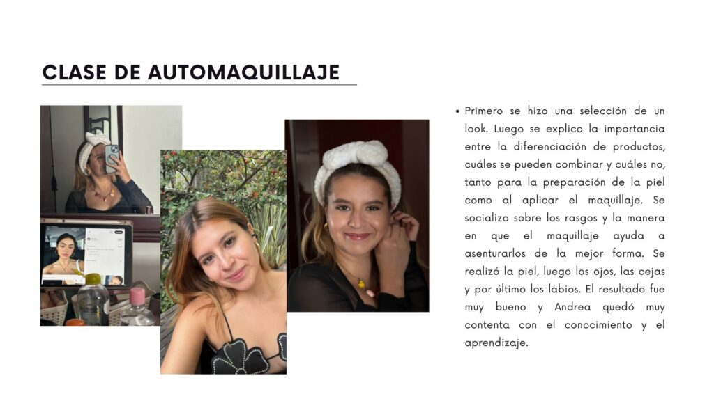 Como complemento, realizaremos una clase de automaquillaje con asesoramiento en productos dermatológicos y rutinas de cuidado de la piel, y una salida de campo a boutiques y centros comerciales para explorar las tipologías de prendas y estilos.