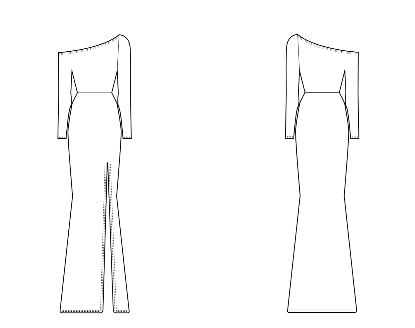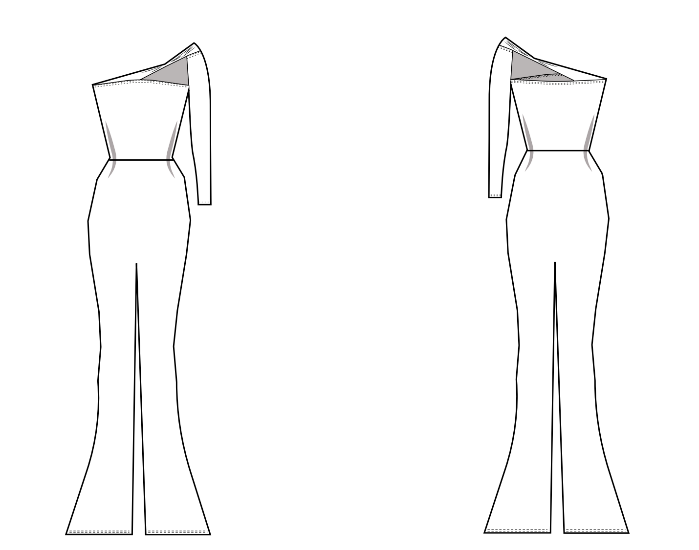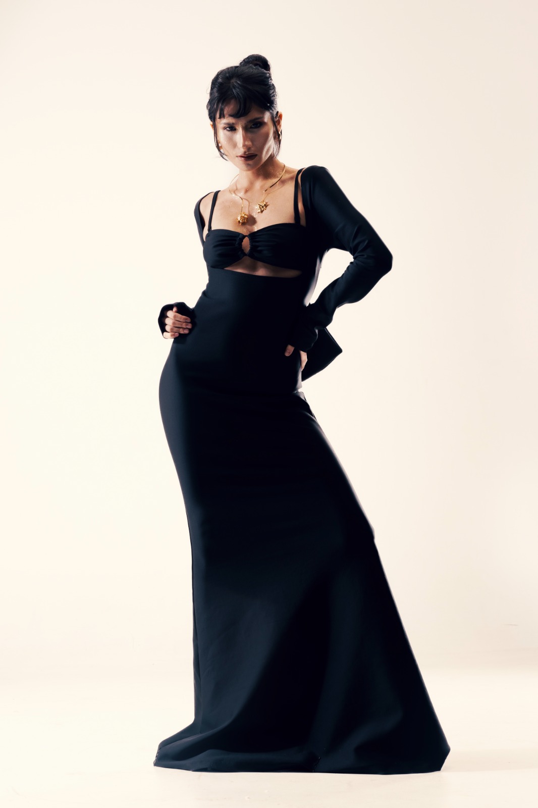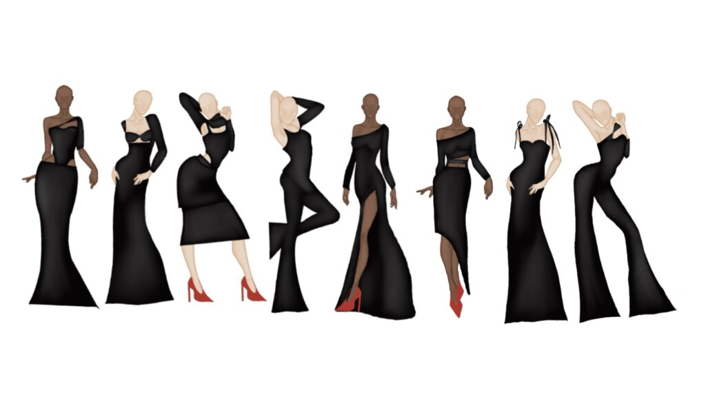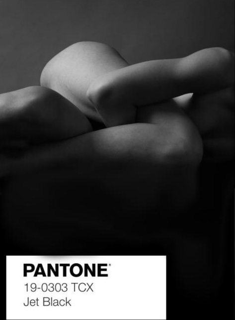 La paleta de color esta compuesta unicamente por el color negro ya que es un color que hace referencia a la narrativa conceptual de la colección, la profundidad del tono nos da a relucir la forma del cuerpo de la clienta, haciendolo lucir elegante y sobrio. Generalmente las sombras son de un color oscuro debido a la interrupción de luz en el espacio, sin embargo su linealidad es casi perfecta y orgánica.